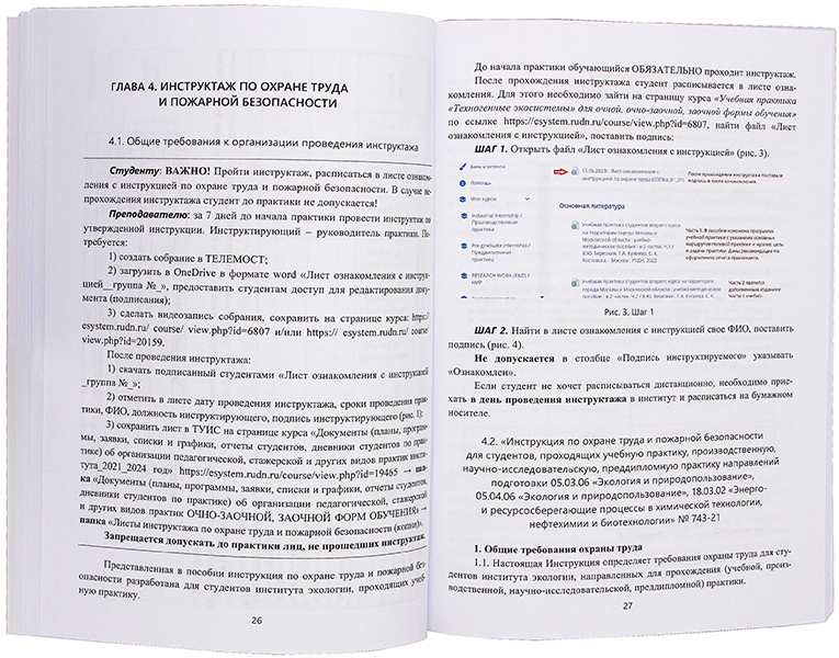 4.2. «Инструкция по охране труда и пожарной безопасности для студентов, проходящих учебную практику, производственную, научно-исследовательскую, преддипломную практику направлений подготовки 05.03.06 «Экология и природопользование»,