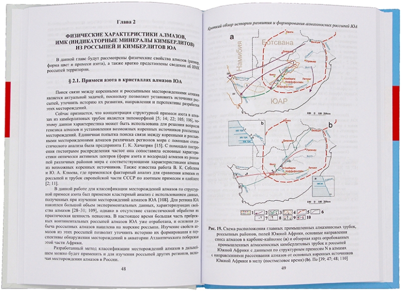 На основании обобщения материалов из современной зарубежной и отечественной литературы по стратиграфии, магматизму, тектонике, геоморфологии, истории развития коренной и россыпной алмазоносности Южной Африки собраны данные по алмазоносности мел-кайнозойских россыпей данного региона. Выделен ряд новых фактов в истории формирования алмазоносных россыпей региона на основании физических свойств алмазов; систематизированы факторы контроля и история развития россыпей Южной Африки (ЮА). Даны рекомендации по поискам новых россыпей алмазов в континентальной и морской части региона ЮА. Для преподавателей геологических вузов, а также всех читателей, интересующихся геологией алмазов.
