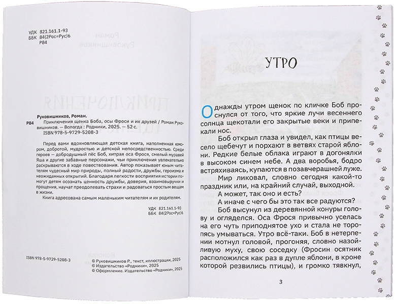 Перед вами вдохновляющая детская книга, наполненная юмором, добротой, мудростью и детской непосредственностью. Среди героев — добродушный пёс Боб, хитрая оса Фрося, смелый муравей Яша и другие забавные персонажи, чьи приключения увлекательно раскрываются в ходе повествования. Автор показывает юным читателям чудесный мир природы, полный радости, дружбы, героизма и неожиданных открытий. Благодаря легкости восприятия истории помогут детям осознать ценность дружбы, доверия, взаимовыручки и прощения, научат преодолевать страхи и радоваться простым вещам в жизни. Книга адресована самым маленьким читателям и их родителям. 0+